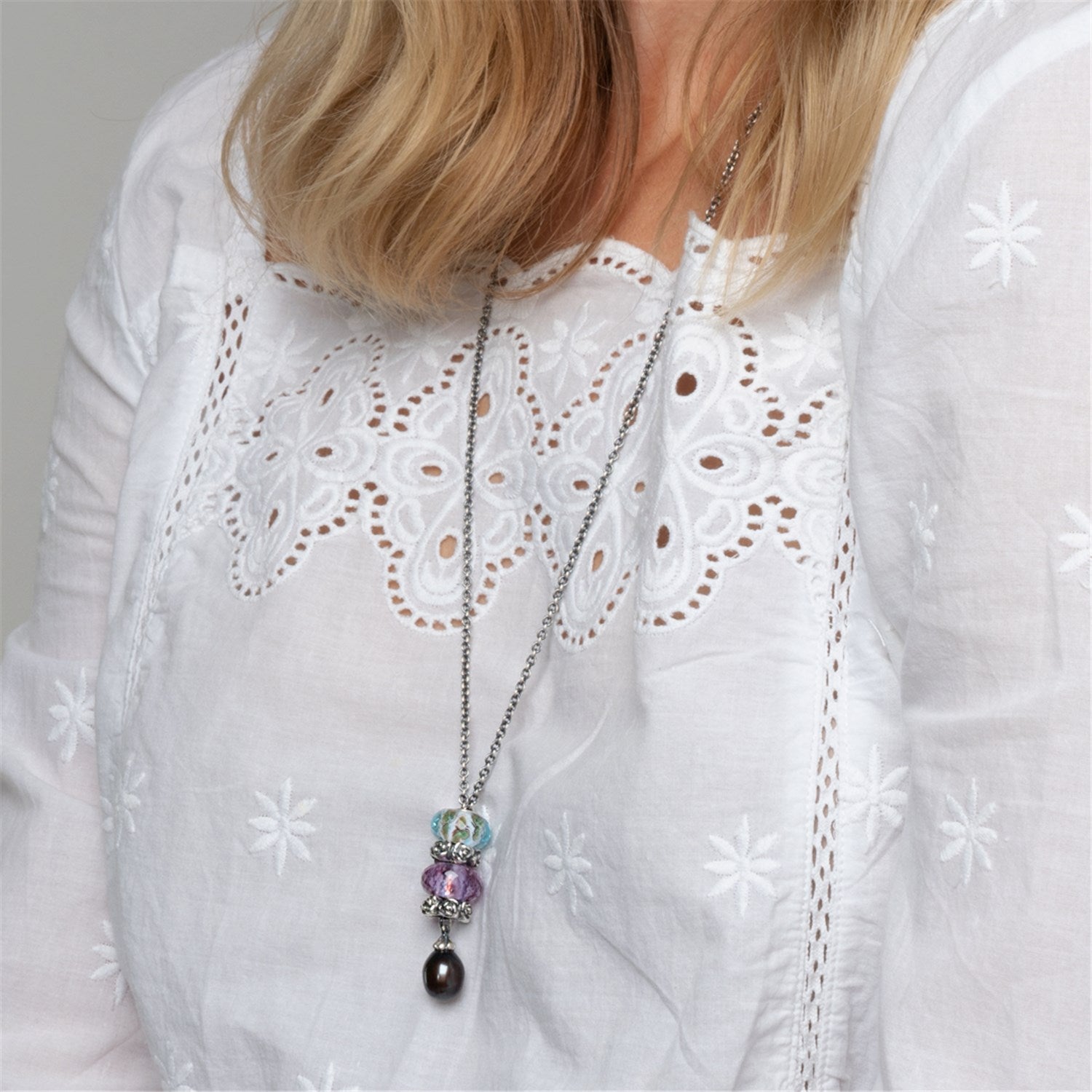 這款項鍊為 925 純銀的材質,經過墨銀的處理,鏈子的本身呈現暗茶色,鏈子本身柔軟,不糾結或不易纏繞頭髮。吊墜的款式多樣,從寶石、珍珠、到銀飾,此鏈的吊墜是不可拆卸的。幻想 halskæde med enfacetteret onyx dråbe