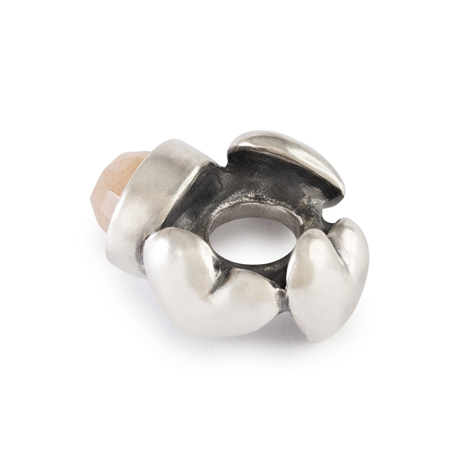 Three hearts embrace a faceted Feldspar Moonstone that shimmers with soft, warm tones. The design symbolizes care, affection and the gentle strength of love.
